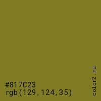 Цвет #817C23 в цветовой модели RGB обозначается тремя октетами (129, 124, 35) в десятичном формате и #817C23 в шестнадцатиричном (hex) формате, которые являются интенсивностью красного 129 (hex 81), интенсивность зелёного 124 (hex 7C) и интенсивность синего 35 (hex 23).