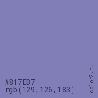 Цвет #817EB7 в цветовой модели RGB обозначается тремя октетами (129, 126, 183) в десятичном формате и #817EB7 в шестнадцатиричном (hex) формате, которые являются интенсивностью красного 129 (hex 81), интенсивность зелёного 126 (hex 7E) и интенсивность синего 183 (hex B7).