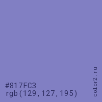 Цвет #817FC3 в цветовой модели RGB обозначается тремя октетами (129, 127, 195) в десятичном формате и #817FC3 в шестнадцатиричном (hex) формате, которые являются интенсивностью красного 129 (hex 81), интенсивность зелёного 127 (hex 7F) и интенсивность синего 195 (hex C3).