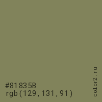 Цвет #81835B в цветовой модели RGB обозначается тремя октетами (129, 131, 91) в десятичном формате и #81835B в шестнадцатиричном (hex) формате, которые являются интенсивностью красного 129 (hex 81), интенсивность зелёного 131 (hex 83) и интенсивность синего 91 (hex 5B).
