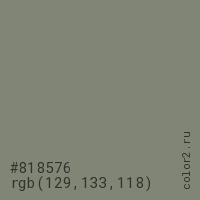 Цвет #818576 в цветовой модели RGB обозначается тремя октетами (129, 133, 118) в десятичном формате и #818576 в шестнадцатиричном (hex) формате, которые являются интенсивностью красного 129 (hex 81), интенсивность зелёного 133 (hex 85) и интенсивность синего 118 (hex 76).