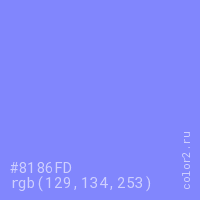 Цвет #8186FD в цветовой модели RGB обозначается тремя октетами (129, 134, 253) в десятичном формате и #8186FD в шестнадцатиричном (hex) формате, которые являются интенсивностью красного 129 (hex 81), интенсивность зелёного 134 (hex 86) и интенсивность синего 253 (hex FD).