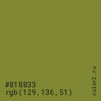 Цвет #818833 в цветовой модели RGB обозначается тремя октетами (129, 136, 51) в десятичном формате и #818833 в шестнадцатиричном (hex) формате, которые являются интенсивностью красного 129 (hex 81), интенсивность зелёного 136 (hex 88) и интенсивность синего 51 (hex 33).