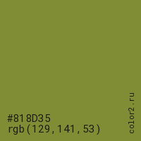 Цвет #818D35 в цветовой модели RGB обозначается тремя октетами (129, 141, 53) в десятичном формате и #818D35 в шестнадцатиричном (hex) формате, которые являются интенсивностью красного 129 (hex 81), интенсивность зелёного 141 (hex 8D) и интенсивность синего 53 (hex 35).