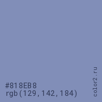Цвет #818EB8 в цветовой модели RGB обозначается тремя октетами (129, 142, 184) в десятичном формате и #818EB8 в шестнадцатиричном (hex) формате, которые являются интенсивностью красного 129 (hex 81), интенсивность зелёного 142 (hex 8E) и интенсивность синего 184 (hex B8).