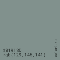 Цвет #81918D в цветовой модели RGB обозначается тремя октетами (129, 145, 141) в десятичном формате и #81918D в шестнадцатиричном (hex) формате, которые являются интенсивностью красного 129 (hex 81), интенсивность зелёного 145 (hex 91) и интенсивность синего 141 (hex 8D).