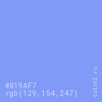 Цвет #819AF7 в цветовой модели RGB обозначается тремя октетами (129, 154, 247) в десятичном формате и #819AF7 в шестнадцатиричном (hex) формате, которые являются интенсивностью красного 129 (hex 81), интенсивность зелёного 154 (hex 9A) и интенсивность синего 247 (hex F7).