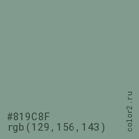 Цвет #819C8F в цветовой модели RGB обозначается тремя октетами (129, 156, 143) в десятичном формате и #819C8F в шестнадцатиричном (hex) формате, которые являются интенсивностью красного 129 (hex 81), интенсивность зелёного 156 (hex 9C) и интенсивность синего 143 (hex 8F).
