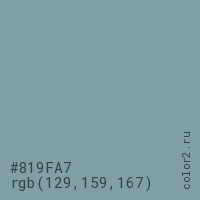 Цвет #819FA7 в цветовой модели RGB обозначается тремя октетами (129, 159, 167) в десятичном формате и #819FA7 в шестнадцатиричном (hex) формате, которые являются интенсивностью красного 129 (hex 81), интенсивность зелёного 159 (hex 9F) и интенсивность синего 167 (hex A7).