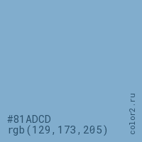Цвет #81ADCD в цветовой модели RGB обозначается тремя октетами (129, 173, 205) в десятичном формате и #81ADCD в шестнадцатиричном (hex) формате, которые являются интенсивностью красного 129 (hex 81), интенсивность зелёного 173 (hex AD) и интенсивность синего 205 (hex CD).