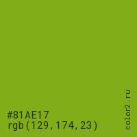 Цвет #81AE17 в цветовой модели RGB обозначается тремя октетами (129, 174, 23) в десятичном формате и #81AE17 в шестнадцатиричном (hex) формате, которые являются интенсивностью красного 129 (hex 81), интенсивность зелёного 174 (hex AE) и интенсивность синего 23 (hex 17).