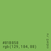 Цвет #81B858 в цветовой модели RGB обозначается тремя октетами (129, 184, 88) в десятичном формате и #81B858 в шестнадцатиричном (hex) формате, которые являются интенсивностью красного 129 (hex 81), интенсивность зелёного 184 (hex B8) и интенсивность синего 88 (hex 58).