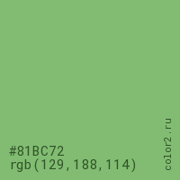 Цвет #81BC72 в цветовой модели RGB обозначается тремя октетами (129, 188, 114) в десятичном формате и #81BC72 в шестнадцатиричном (hex) формате, которые являются интенсивностью красного 129 (hex 81), интенсивность зелёного 188 (hex BC) и интенсивность синего 114 (hex 72).