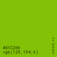 Цвет #81C206 в цветовой модели RGB обозначается тремя октетами (129, 194, 6) в десятичном формате и #81C206 в шестнадцатиричном (hex) формате, которые являются интенсивностью красного 129 (hex 81), интенсивность зелёного 194 (hex C2) и интенсивность синего 6 (hex 06).