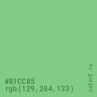 Цвет #81CC85 в цветовой модели RGB обозначается тремя октетами (129, 204, 133) в десятичном формате и #81CC85 в шестнадцатиричном (hex) формате, которые являются интенсивностью красного 129 (hex 81), интенсивность зелёного 204 (hex CC) и интенсивность синего 133 (hex 85).