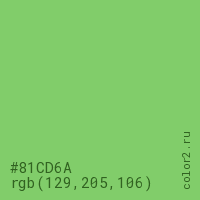 Цвет #81CD6A в цветовой модели RGB обозначается тремя октетами (129, 205, 106) в десятичном формате и #81CD6A в шестнадцатиричном (hex) формате, которые являются интенсивностью красного 129 (hex 81), интенсивность зелёного 205 (hex CD) и интенсивность синего 106 (hex 6A).