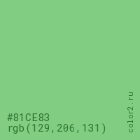 Цвет #81CE83 в цветовой модели RGB обозначается тремя октетами (129, 206, 131) в десятичном формате и #81CE83 в шестнадцатиричном (hex) формате, которые являются интенсивностью красного 129 (hex 81), интенсивность зелёного 206 (hex CE) и интенсивность синего 131 (hex 83).