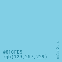 Цвет #81CFE5 в цветовой модели RGB обозначается тремя октетами (129, 207, 229) в десятичном формате и #81CFE5 в шестнадцатиричном (hex) формате, которые являются интенсивностью красного 129 (hex 81), интенсивность зелёного 207 (hex CF) и интенсивность синего 229 (hex E5).
