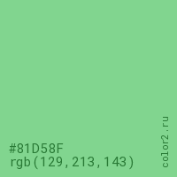 Цвет #81D58F в цветовой модели RGB обозначается тремя октетами (129, 213, 143) в десятичном формате и #81D58F в шестнадцатиричном (hex) формате, которые являются интенсивностью красного 129 (hex 81), интенсивность зелёного 213 (hex D5) и интенсивность синего 143 (hex 8F).