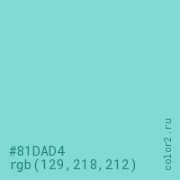 Цвет #81DAD4 в цветовой модели RGB обозначается тремя октетами (129, 218, 212) в десятичном формате и #81DAD4 в шестнадцатиричном (hex) формате, которые являются интенсивностью красного 129 (hex 81), интенсивность зелёного 218 (hex DA) и интенсивность синего 212 (hex D4).