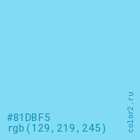 Цвет #81DBF5 в цветовой модели RGB обозначается тремя октетами (129, 219, 245) в десятичном формате и #81DBF5 в шестнадцатиричном (hex) формате, которые являются интенсивностью красного 129 (hex 81), интенсивность зелёного 219 (hex DB) и интенсивность синего 245 (hex F5).