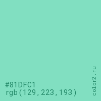 Цвет #81DFC1 в цветовой модели RGB обозначается тремя октетами (129, 223, 193) в десятичном формате и #81DFC1 в шестнадцатиричном (hex) формате, которые являются интенсивностью красного 129 (hex 81), интенсивность зелёного 223 (hex DF) и интенсивность синего 193 (hex C1).
