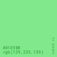 Цвет #81E98B в цветовой модели RGB обозначается тремя октетами (129, 233, 139) в десятичном формате и #81E98B в шестнадцатиричном (hex) формате, которые являются интенсивностью красного 129 (hex 81), интенсивность зелёного 233 (hex E9) и интенсивность синего 139 (hex 8B).