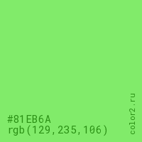Цвет RGB(129, 235, 106) в процентом отношении количества цвета состоит из 50.6% красного (red), 92.2% зелёного (green) и 41.6% синего (blue).