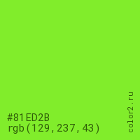 Цвет #81ED2B в цветовой модели RGB обозначается тремя октетами (129, 237, 43) в десятичном формате и #81ED2B в шестнадцатиричном (hex) формате, которые являются интенсивностью красного 129 (hex 81), интенсивность зелёного 237 (hex ED) и интенсивность синего 43 (hex 2B).