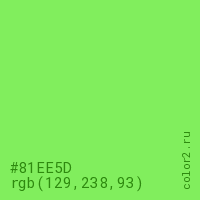Цвет #81EE5D в цветовой модели RGB обозначается тремя октетами (129, 238, 93) в десятичном формате и #81EE5D в шестнадцатиричном (hex) формате, которые являются интенсивностью красного 129 (hex 81), интенсивность зелёного 238 (hex EE) и интенсивность синего 93 (hex 5D).