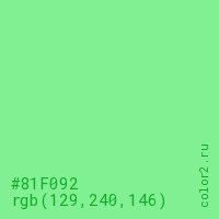 Цвет #81F092 в цветовой модели RGB обозначается тремя октетами (129, 240, 146) в десятичном формате и #81F092 в шестнадцатиричном (hex) формате, которые являются интенсивностью красного 129 (hex 81), интенсивность зелёного 240 (hex F0) и интенсивность синего 146 (hex 92).