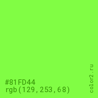 Цвет #81FD44 в цветовой модели RGB обозначается тремя октетами (129, 253, 68) в десятичном формате и #81FD44 в шестнадцатиричном (hex) формате, которые являются интенсивностью красного 129 (hex 81), интенсивность зелёного 253 (hex FD) и интенсивность синего 68 (hex 44).