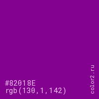 Цвет #82018E в цветовой модели RGB обозначается тремя октетами (130, 1, 142) в десятичном формате и #82018E в шестнадцатиричном (hex) формате, которые являются интенсивностью красного 130 (hex 82), интенсивность зелёного 1 (hex 01) и интенсивность синего 142 (hex 8E).