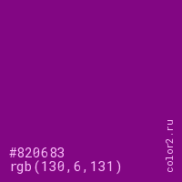 Цвет #820683 в цветовой модели RGB обозначается тремя октетами (130, 6, 131) в десятичном формате и #820683 в шестнадцатиричном (hex) формате, которые являются интенсивностью красного 130 (hex 82), интенсивность зелёного 6 (hex 06) и интенсивность синего 131 (hex 83).