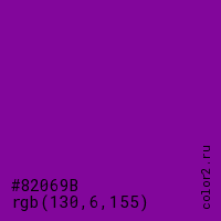 Цвет #82069B в цветовой модели RGB обозначается тремя октетами (130, 6, 155) в десятичном формате и #82069B в шестнадцатиричном (hex) формате, которые являются интенсивностью красного 130 (hex 82), интенсивность зелёного 6 (hex 06) и интенсивность синего 155 (hex 9B).