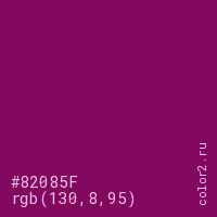 Цвет #82085F в цветовой модели RGB обозначается тремя октетами (130, 8, 95) в десятичном формате и #82085F в шестнадцатиричном (hex) формате, которые являются интенсивностью красного 130 (hex 82), интенсивность зелёного 8 (hex 08) и интенсивность синего 95 (hex 5F).