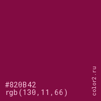 Цвет #820B42 в цветовой модели RGB обозначается тремя октетами (130, 11, 66) в десятичном формате и #820B42 в шестнадцатиричном (hex) формате, которые являются интенсивностью красного 130 (hex 82), интенсивность зелёного 11 (hex 0B) и интенсивность синего 66 (hex 42).