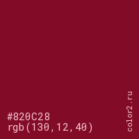 Цвет #820C28 в цветовой модели RGB обозначается тремя октетами (130, 12, 40) в десятичном формате и #820C28 в шестнадцатиричном (hex) формате, которые являются интенсивностью красного 130 (hex 82), интенсивность зелёного 12 (hex 0C) и интенсивность синего 40 (hex 28).