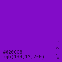 Цвет #820CC8 в цветовой модели RGB обозначается тремя октетами (130, 12, 200) в десятичном формате и #820CC8 в шестнадцатиричном (hex) формате, которые являются интенсивностью красного 130 (hex 82), интенсивность зелёного 12 (hex 0C) и интенсивность синего 200 (hex C8).