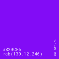 Цвет #820CF6 в цветовой модели RGB обозначается тремя октетами (130, 12, 246) в десятичном формате и #820CF6 в шестнадцатиричном (hex) формате, которые являются интенсивностью красного 130 (hex 82), интенсивность зелёного 12 (hex 0C) и интенсивность синего 246 (hex F6).
