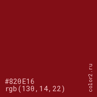 Цвет #820E16 в цветовой модели RGB обозначается тремя октетами (130, 14, 22) в десятичном формате и #820E16 в шестнадцатиричном (hex) формате, которые являются интенсивностью красного 130 (hex 82), интенсивность зелёного 14 (hex 0E) и интенсивность синего 22 (hex 16).