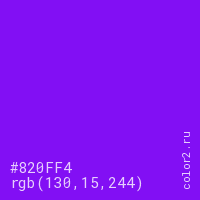 Цвет #820FF4 в цветовой модели RGB обозначается тремя октетами (130, 15, 244) в десятичном формате и #820FF4 в шестнадцатиричном (hex) формате, которые являются интенсивностью красного 130 (hex 82), интенсивность зелёного 15 (hex 0F) и интенсивность синего 244 (hex F4).