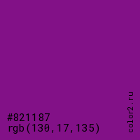 Цвет #821187 в цветовой модели RGB обозначается тремя октетами (130, 17, 135) в десятичном формате и #821187 в шестнадцатиричном (hex) формате, которые являются интенсивностью красного 130 (hex 82), интенсивность зелёного 17 (hex 11) и интенсивность синего 135 (hex 87).