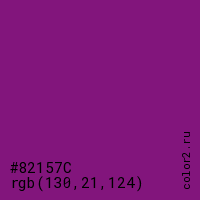 Цвет #82157C в цветовой модели RGB обозначается тремя октетами (130, 21, 124) в десятичном формате и #82157C в шестнадцатиричном (hex) формате, которые являются интенсивностью красного 130 (hex 82), интенсивность зелёного 21 (hex 15) и интенсивность синего 124 (hex 7C).