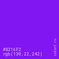 Цвет #8216F2 в цветовой модели RGB обозначается тремя октетами (130, 22, 242) в десятичном формате и #8216F2 в шестнадцатиричном (hex) формате, которые являются интенсивностью красного 130 (hex 82), интенсивность зелёного 22 (hex 16) и интенсивность синего 242 (hex F2).