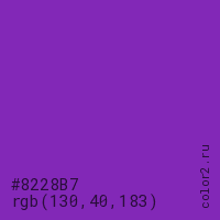 Цвет #8228B7 в цветовой модели RGB обозначается тремя октетами (130, 40, 183) в десятичном формате и #8228B7 в шестнадцатиричном (hex) формате, которые являются интенсивностью красного 130 (hex 82), интенсивность зелёного 40 (hex 28) и интенсивность синего 183 (hex B7).