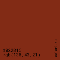Цвет #822B15 в цветовой модели RGB обозначается тремя октетами (130, 43, 21) в десятичном формате и #822B15 в шестнадцатиричном (hex) формате, которые являются интенсивностью красного 130 (hex 82), интенсивность зелёного 43 (hex 2B) и интенсивность синего 21 (hex 15).