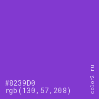 Цвет #8239D0 в цветовой модели RGB обозначается тремя октетами (130, 57, 208) в десятичном формате и #8239D0 в шестнадцатиричном (hex) формате, которые являются интенсивностью красного 130 (hex 82), интенсивность зелёного 57 (hex 39) и интенсивность синего 208 (hex D0).