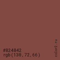 Цвет #824842 в цветовой модели RGB обозначается тремя октетами (130, 72, 66) в десятичном формате и #824842 в шестнадцатиричном (hex) формате, которые являются интенсивностью красного 130 (hex 82), интенсивность зелёного 72 (hex 48) и интенсивность синего 66 (hex 42).