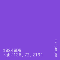 Цвет #8248DB в цветовой модели RGB обозначается тремя октетами (130, 72, 219) в десятичном формате и #8248DB в шестнадцатиричном (hex) формате, которые являются интенсивностью красного 130 (hex 82), интенсивность зелёного 72 (hex 48) и интенсивность синего 219 (hex DB).